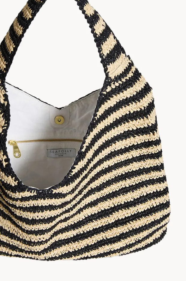 Seafolly Raffia Stripe Tote Bag in Natural/Black features a single shoulder strap, internal zip pocket, magnetic clip closure, and is available in O/S.