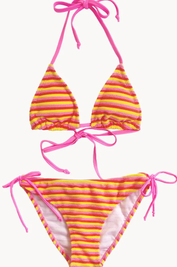Snapper Rock Girls Glow Burst Stripe Tri Set in Pink/Yellow features a triangle top, adjustable straps, matching hipster pant, and is available in sizes 10-16.