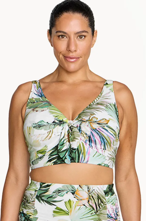 Artesands Lushara Cezanne D/DD Cup Bra in White offers a crop top with mock tie, underwire, soft cups, powermesh, back clip, is best suited to D-DD cup sizes.