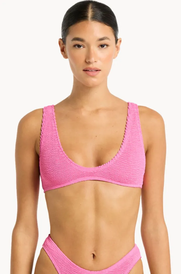 Bond-Eye Recycled Scout Crop in Candy features a bralette style, fixed straps, pull-on design, open neckline, and is best suited to A-D cup sizes.