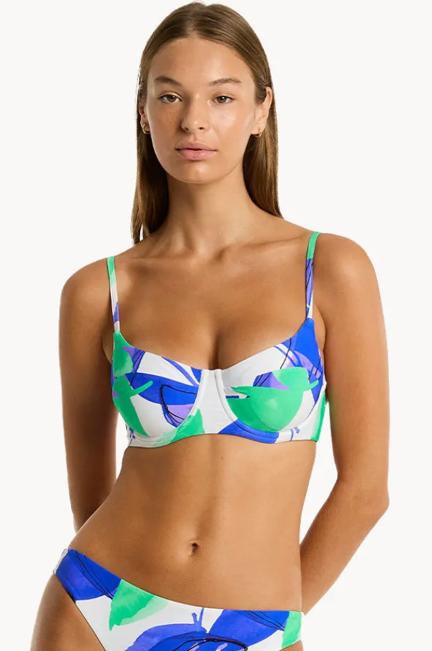 The Sea Level Sublime Balconette Bra in Cobalt features a balconette design, underwire support, and adjustable straps, designed for sizes 8-16.