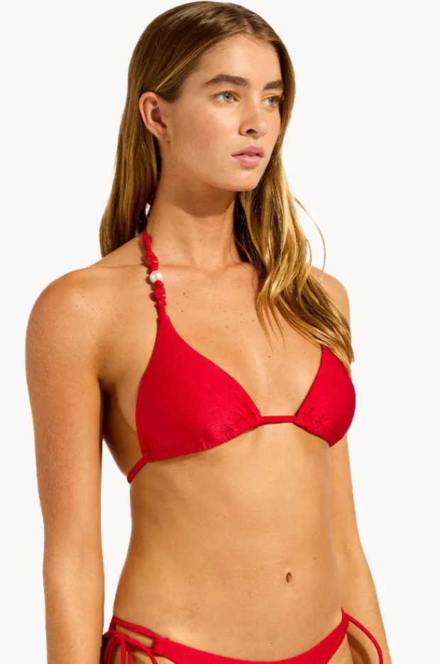 Seafolly Palermo Slide Tri in Red offers a triangle shape, sliding cups, adjustable self ties, removable cups, sustainable, and is best suited to A-C cup sizes.