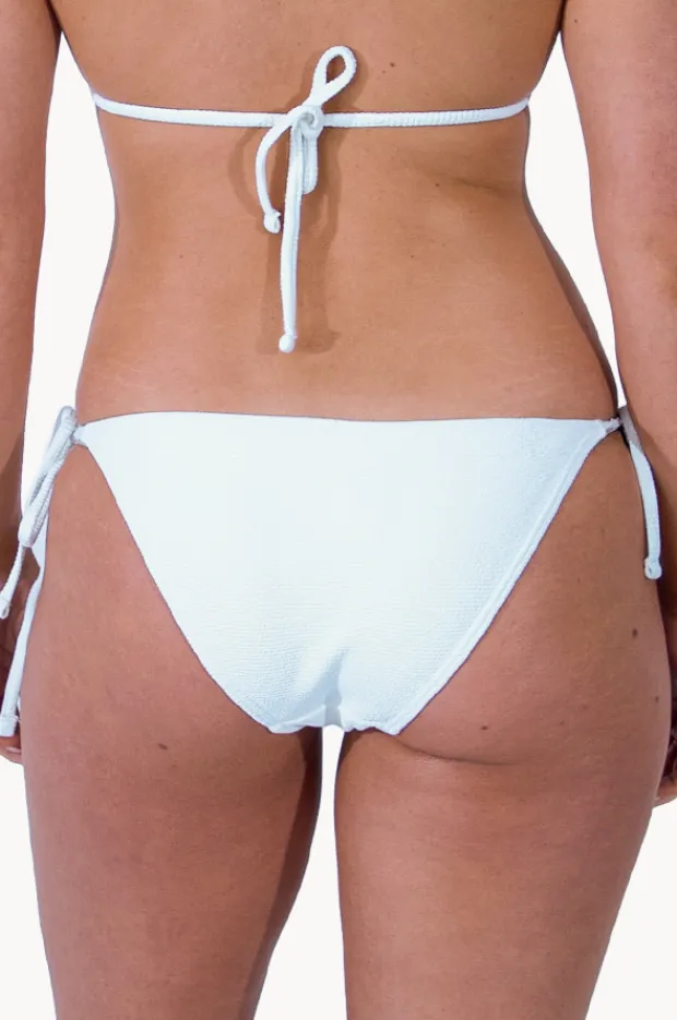 The Base Swim Textured Tie Side Pant in White features a classic tie side fit, adjustable side ties, fully lined, textured fabric, and designed in sizes 6-16.