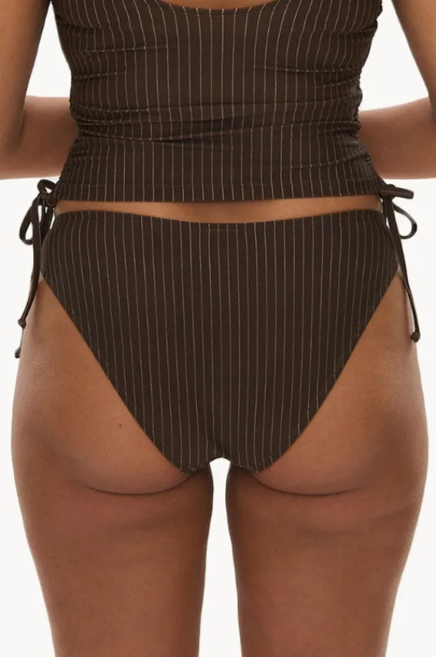 RAQ Pinstripe 90’s Brief in Chocolate features a raised legline, low-medium coverage, shimmer stripe, sustainable thread, and is available in sizes 8-14.