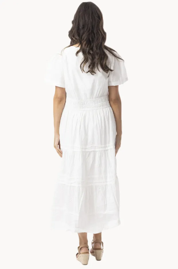 Orientique Essentials Poplin Maxi Dress in White offers a round neckline, short sleeves, ruched waist, maxi length, relaxed fit, and is available in sizes 8-18.