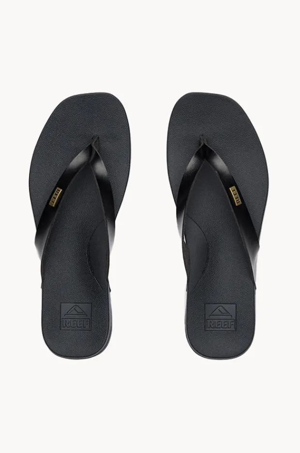 Reef Cushion Lune Thong in Black features a thong design, synthetic leather straps, arch support, contoured footbed, and is available in sizes 6-11.