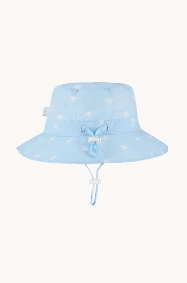 Toshi Girls Palm Spell Sunhat in Sky features a bucket style hat, brim, sun protection rating, chin strap with toggle, and is available in sizes S-XL.
