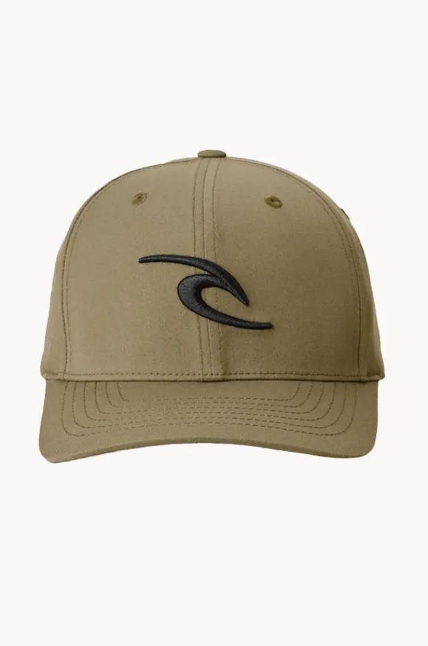Rip Curl Mens Tepan 2.0 Flexfit Cap in Olive features a mid-profile curved peak, embroidered logo, flexfit, structured, and is available in O/S.