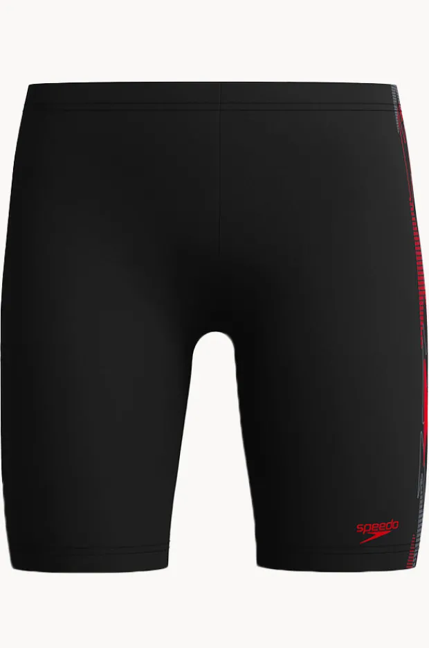Speedo Boys Plastisol Placement Jammer in Black/Red offers an internal drawcord, 4-way stretch, sun protection, sustainable thread, is available in sizes 6-16.
