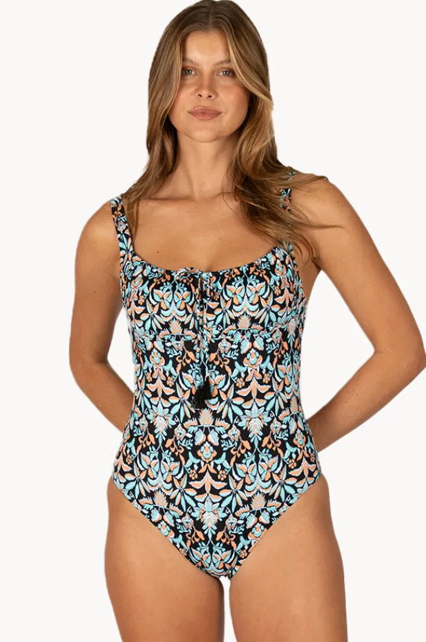 Baku Free Spirit Retro One Piece in Black offers a drawcord neckline with tassel trims, removable cups, adjustable straps, and is best suited to B-D cup sizes.