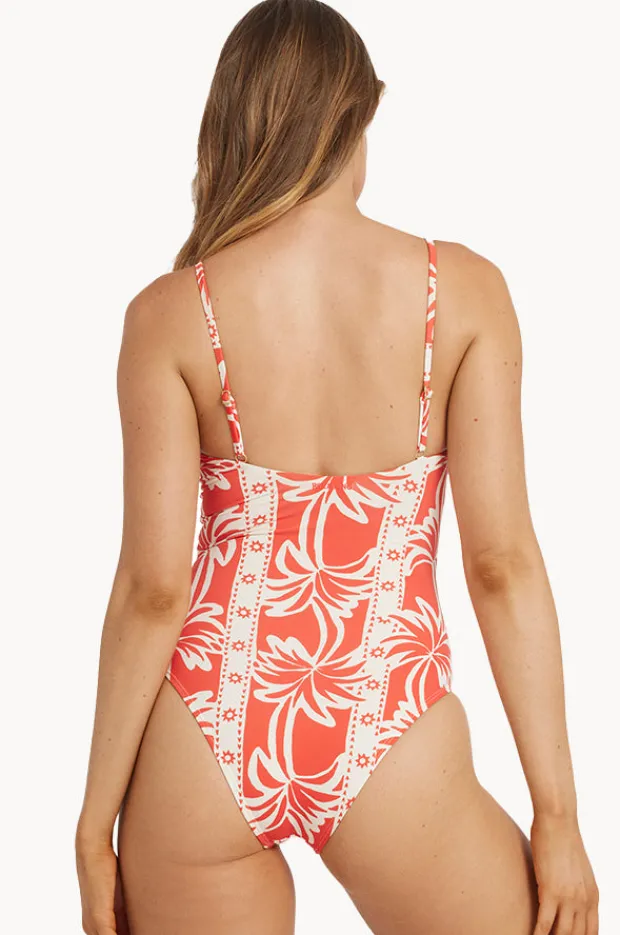 Billabong Row of Palms Bella One Piece in Red offers a square neckline, removable cups, adjustable straps, cheeky coverage, and is best suited to A-C cup sizes.