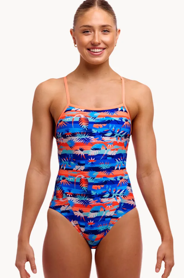 Funkita Forever Fossil Single Strap One Piece in Blue/Orange features single bind straps, quick drying, chlorine resistant, and is best suited to A-C cup sizes.
