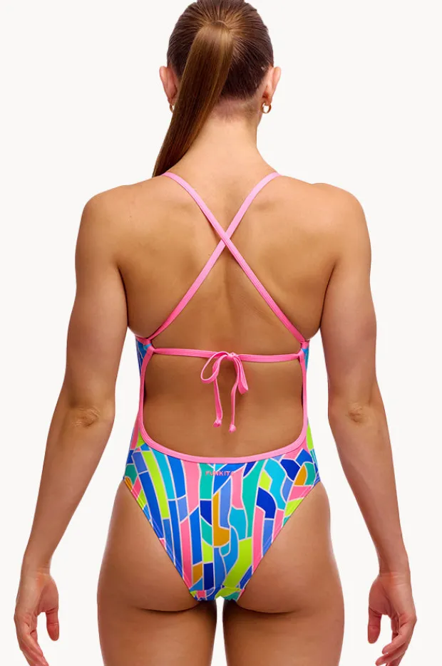 Funkita Pillared Tie Me Tight One Piece in Multi offers cross back straps with tie, cheeky coverage, chlorine resistant, best suited to A-C cup sizes.