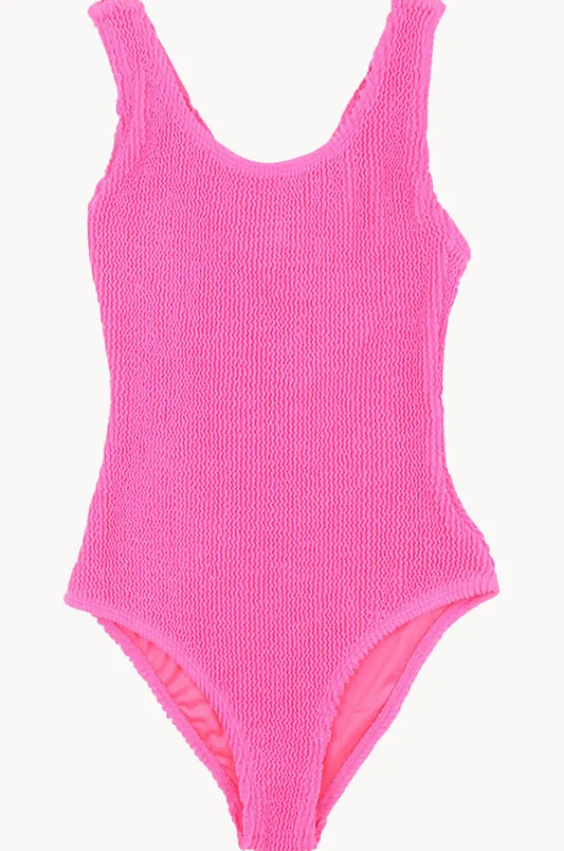 Minihaha Girls Koa One Piece in Fluro Pink features a scoop neckline, cross back straps, stretch crinkle fabric, sun protection, and is available in sizes 6-7.
