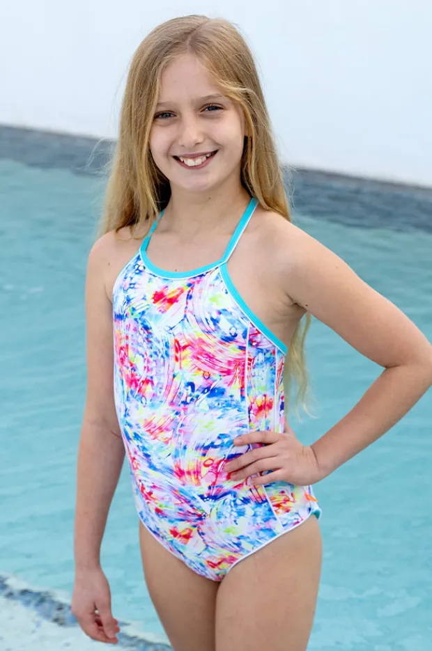 Salty Ink Girls Cosmik Crush One Piece in Multi features adjustable cross back straps, low back, contrast binding, fully lined, and is available in sizes 6-16.