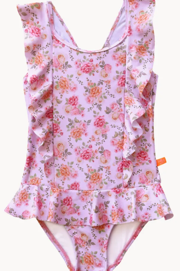Salty Ink Girls Miss Rosie One Piece in Pink features a round neckline, adjustable cross back straps, frill detailing, and is available in sizes 4-7.