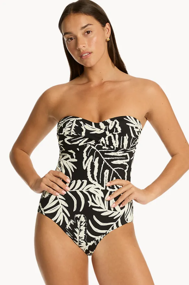 Sea Level Jungle Book Twist Bandeau One Piece in Black features a bandeau neckline, optional straps, soft cups, powermesh, and is best suited to B-D cup sizes.