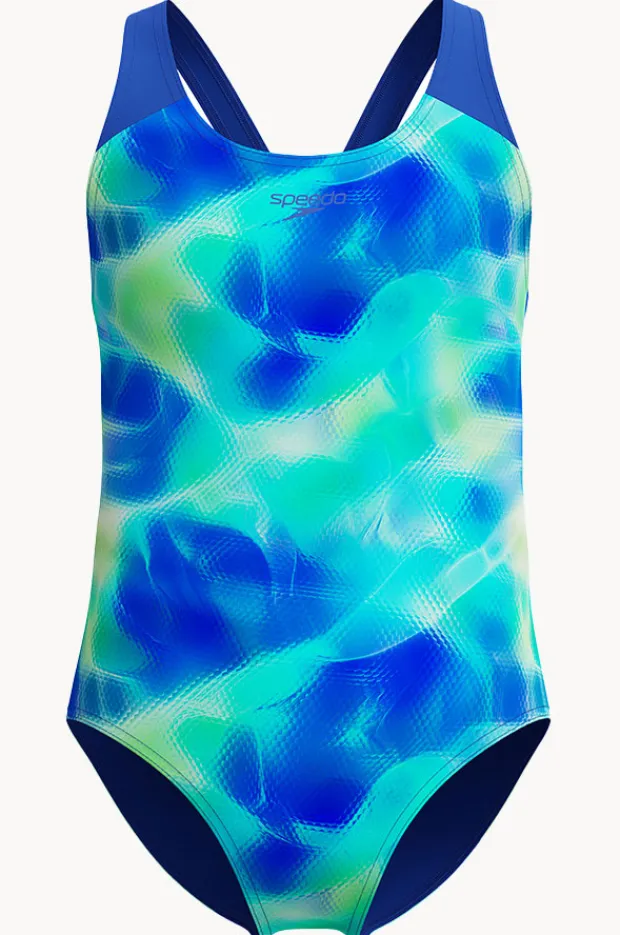 Speedo Girls Allover Print Splashback One Piece in Blue/Green features chlorine resistant thread, splashback strap design, and is available in sizes 8-14.