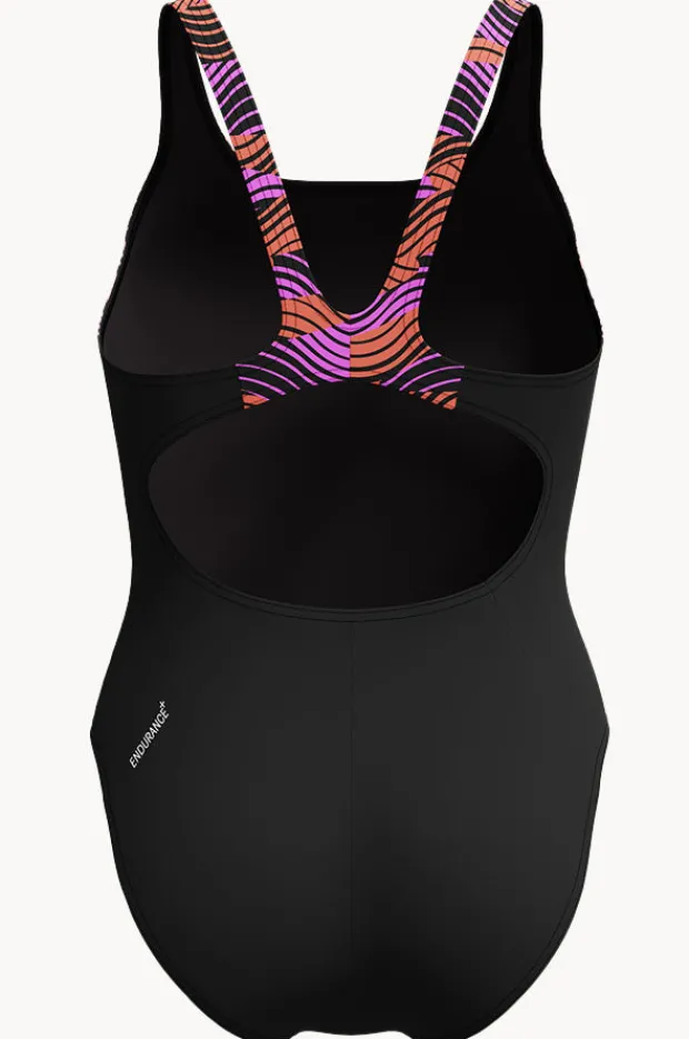 Speedo Hyperboom Splice Muscleback One Piece in Black/Violet features eye-catching splicing detail, is chlorine resistant and is suitable for A-C bust sizes.