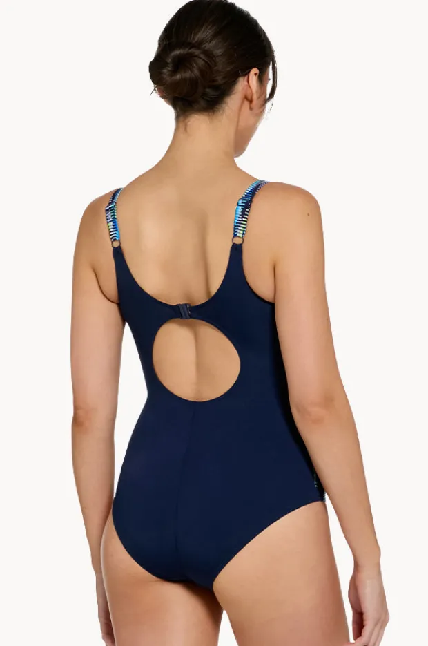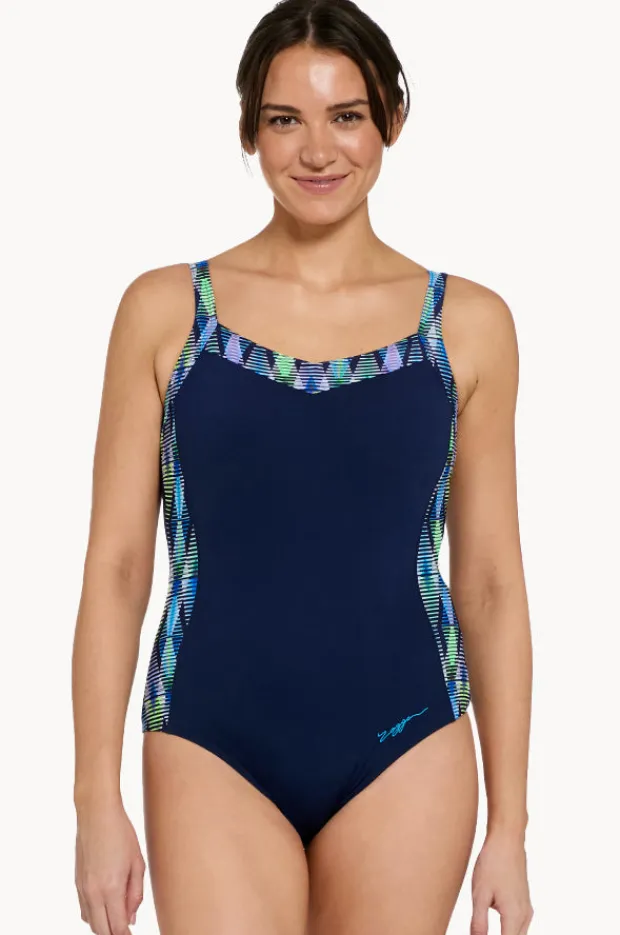 Zoggs Circus Ankor Clipback One Piece in Navy/Blue features adjustable straps, back clip, shelf bra, chlorine resistant thread, is best suited to B-E cup sizes.