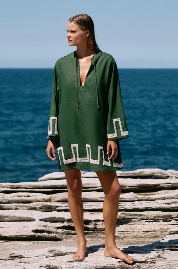 Jets Tirari Nights Embroidered Mini Kaftan in Palm features an oversized silhouette, long sleeves, short length, embroidery detail, is available in sizes XS-L.