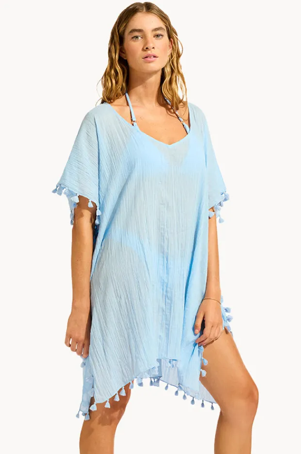 Seafolly Amnesia Kaftan in Cornflower features a V-shaped neckline, short sleeves, relaxed fit, tassel detail, and is available in One Size.