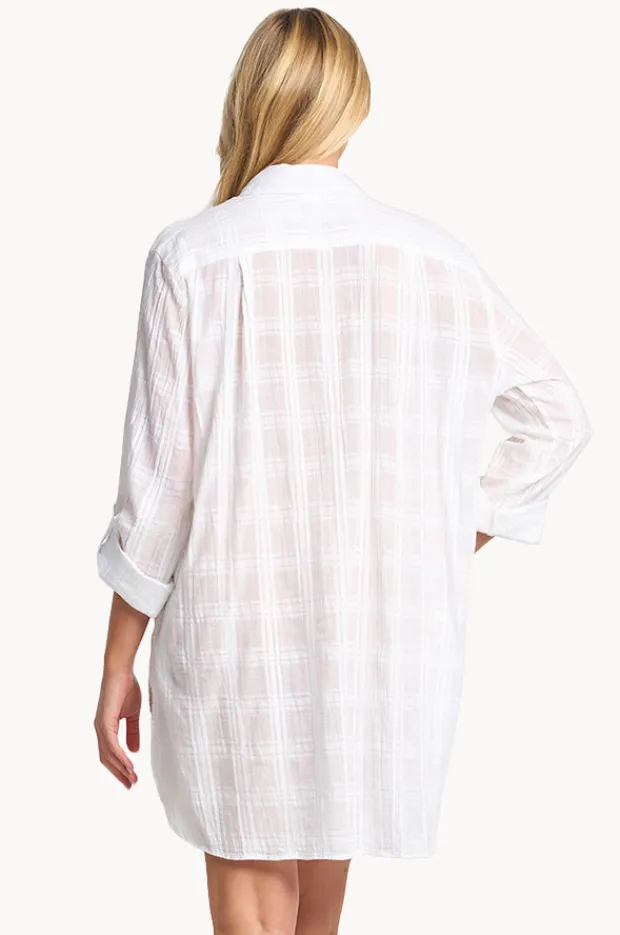Sunseeker Picnic Painters Shirt in White features collared neckline, V-front placket, long sleeves, back yoke with pleats, and is available in sizes XS-L.
