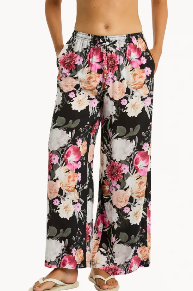 The Sea Level Belle Surf Pant in Black features a comfortable fit, soft fabric, and elastic waistband, designed for sizes 8-16.