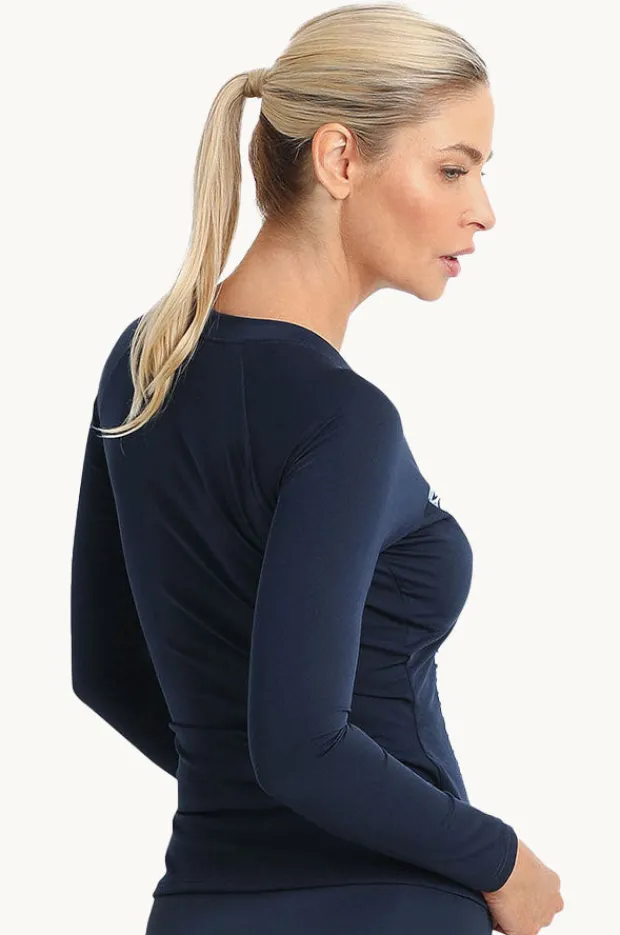 Poolproof Tide Long Sleeve Zip Suntop in Pacific features long sleeves, a full length front zipper, is chlorine resistant and is best suited to A-E cup sizes.