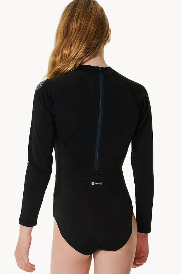 Rip Curl Girls Icon Brushed Sunsuit in Black features a high neckline, back zipper, long sleeves, quick dry fabric, and is available in sizes 8-16.