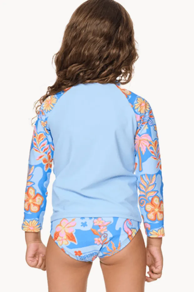 Rip Curl Girls Surf Magic Suntop Set in Sky features a round neckline, long sleeves, UPF 50+ sun protection rating, hipster pant, and is available in sizes 3-8.