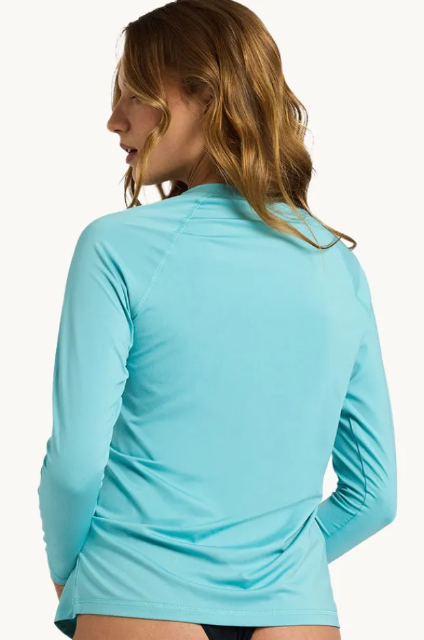 Roxy Essentials Long Sleeve Suntop in Coast offers a round neckline, long sleeves, sun protection, branding detail, loose fit, and is available in sizes S-2XL.