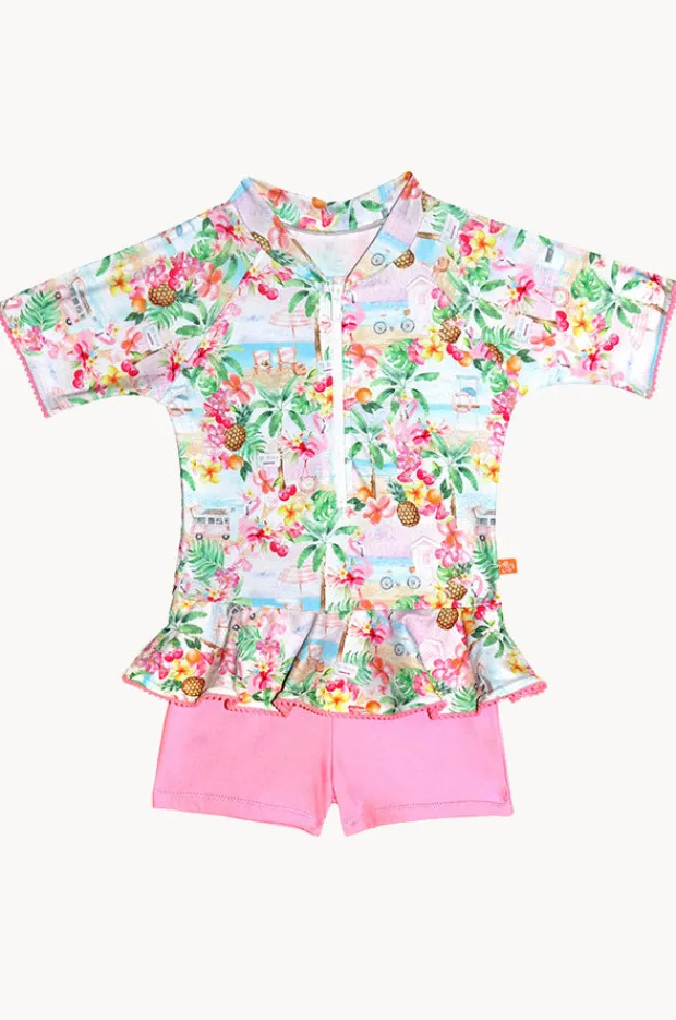 Salty Ink Girls Miss Vacay Short Sleeve Sunsuit in Pink/Multi features a front zipper, short sleeves, sun protection rating, and is available in sizes 3-7.