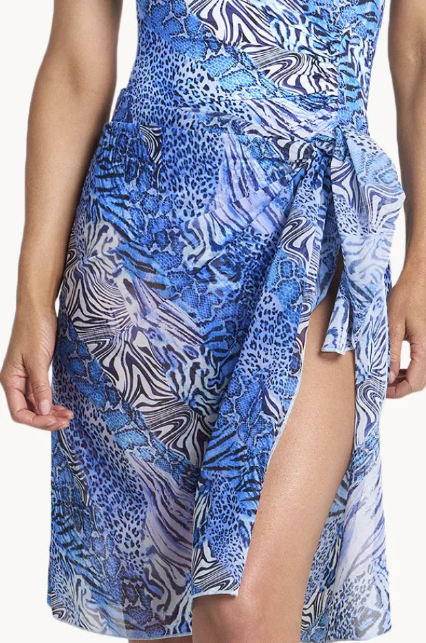 Jantzen Tigeress Midi Mesh Sarong in Navy features shaped tie ends, mid calf length, quick drying mesh fabric, and is available in O/S.