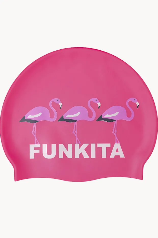 Funkita Go Flamingo Swim Cap in Flamingo features a print decal on sides, suitable for a wide age range, and is made from stretch silicone fabric.