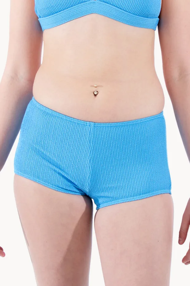 Base Swim Girls Textured Boyleg in Azure features a low-mid rise waist, low legline, boyleg coverage, fully lined, and is available in sizes 8-16.