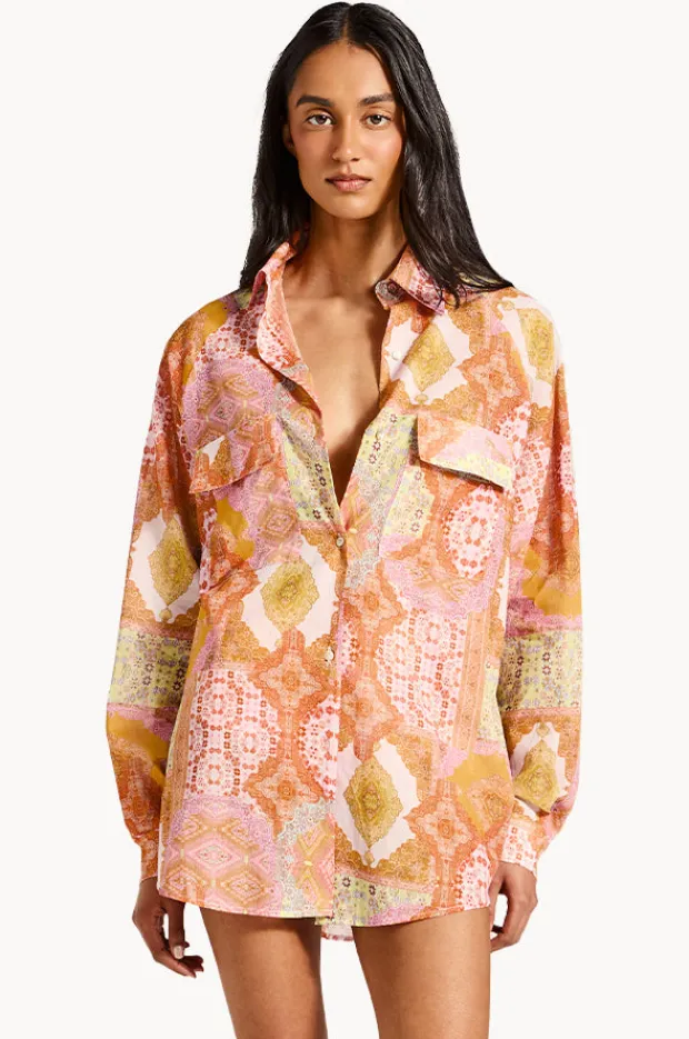 Tigerlily Herra Aura Shirt in Multi features a collared neckline, long sleeves, oversized fit, button through, patch pockets, and is available in sizes 8-14.