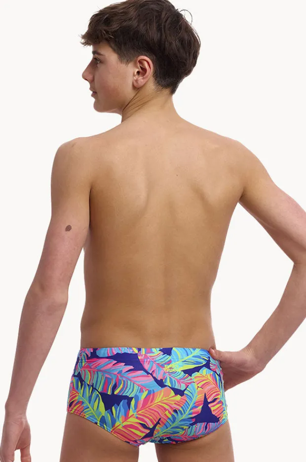 Funky Trunks Boys Leaving Today Trunk in Navy/Multi features an elasticated waistband, drawcord, front lined panel for modesty, and is chlorine resistant.