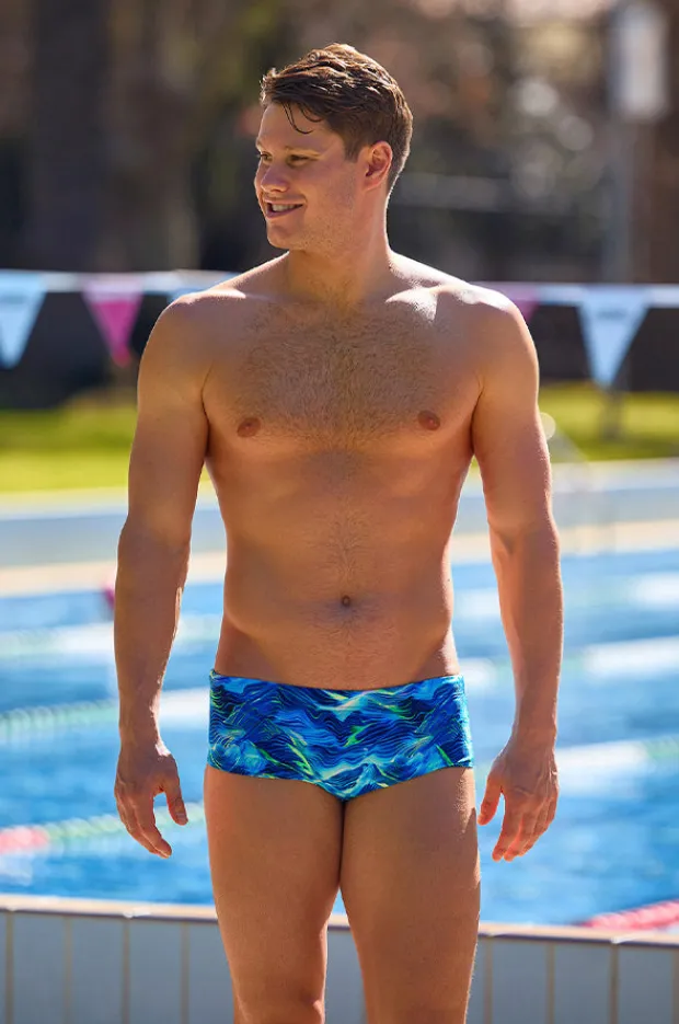 Funky Trunks Mens Storm Chaser Trunk in Blue/Yellow features 16.5cm sides, front lining, elastic waistband and leg openings, and is available in sizes 30-38.