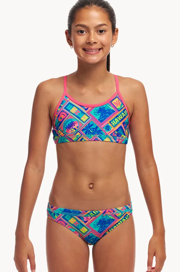 The Funkita Girls Coco Canel Crop Set in Multi includes a crop top and brief, which are chlorine resistant and quick drying, available in sizes 8-14.