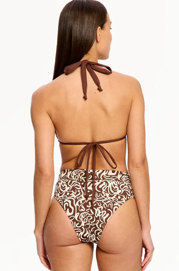 Modibodi Sea Swirl Reversible Multiway Top Set in Chocolate features a triangle shape, high waist pant, period protection, and is available in sizes 8-14.