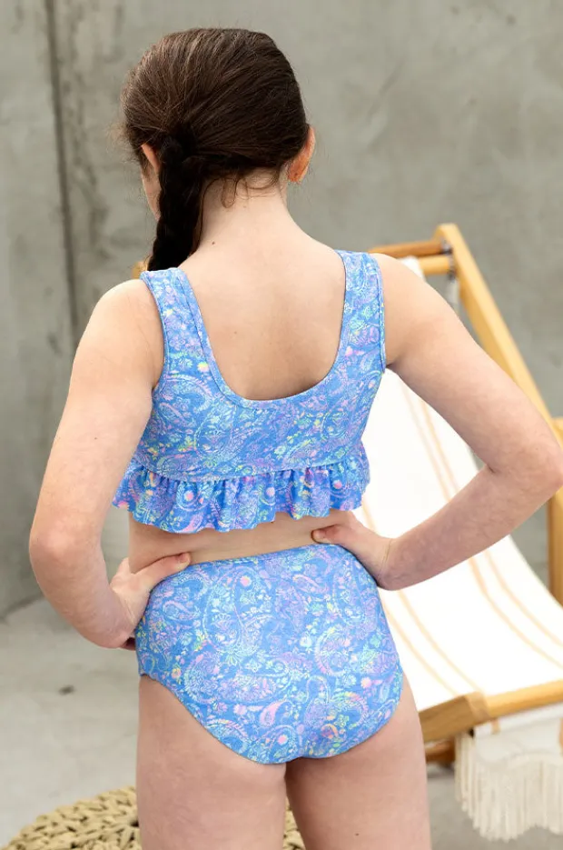 Salty Ink Girls Miss Mystical Reversible Crop Set in Blue/Pink offers a reversible print, crop top, frill detail, mid rise pant, and is available in sizes 4-7.