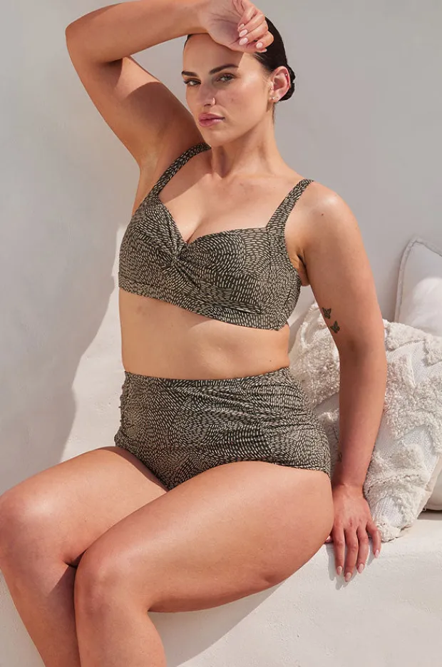 Artesands Onda Perspective Botticelli Bra in Olive features a crop design, soft cups, adjustable straps with strap clip, and is best suited to C-DD cup sizes.