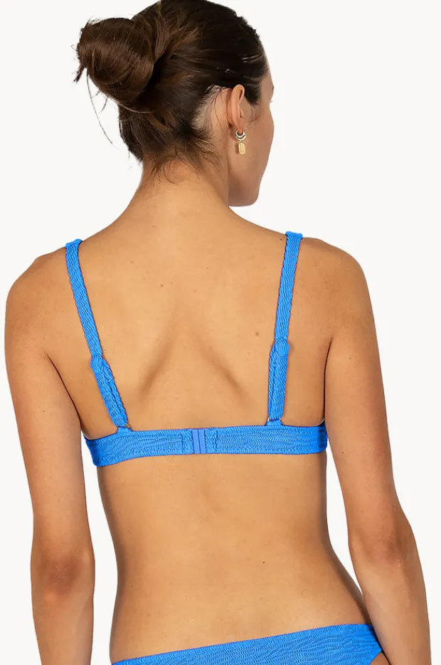 The Baku Ibiza Ring Front Bra in Maya Blue features a bold ring detail, adjustable straps, removable cups, textured fabric, and is best suited to A-D cup sizes.
