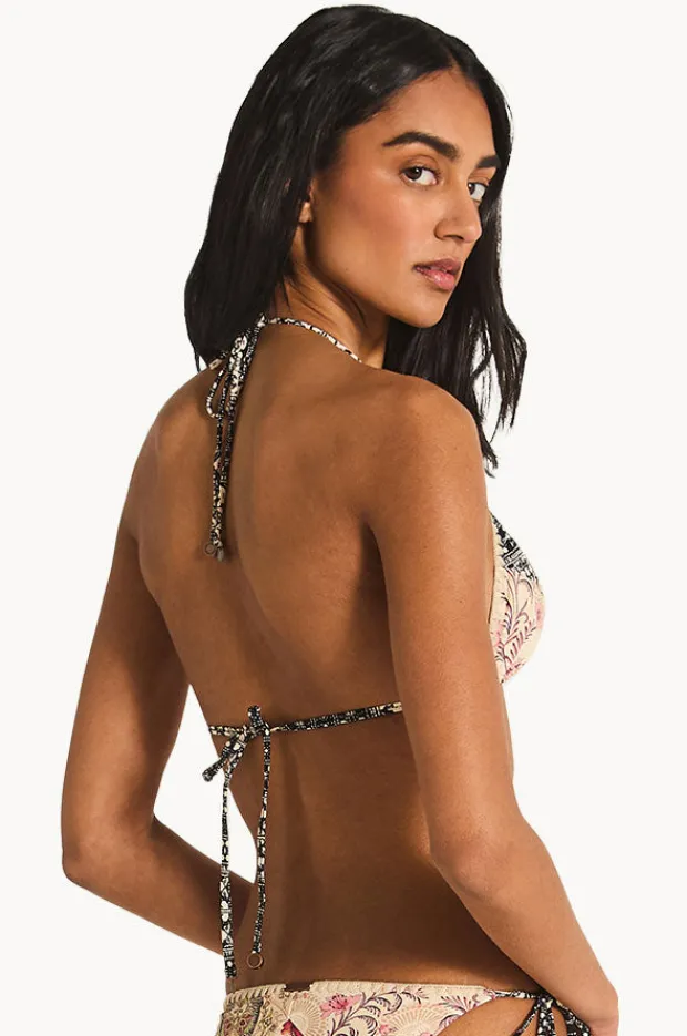 Tigerlily Murasaki Tara Tri in Multi features a triangle shape, removable cups, adjustable ties at neck and back, and is best suited to A-C cup sizes.