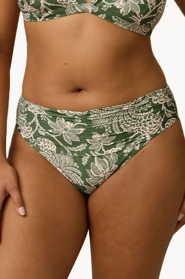 Monte & Lou Zeni Mid Rise Ruched Pant in Olive features a mid rise waist, regular legline, medium coverage, front ruching, and is available in sizes 8-16.
