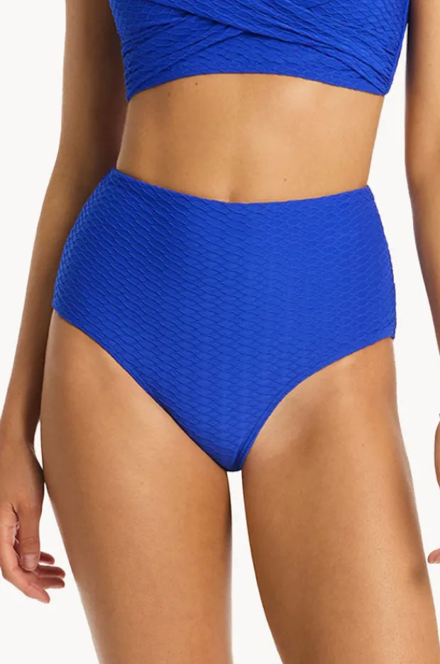 The Sea Level Honeycomb High Waist Pant in Cobalt features a high rise fit, supportive waistband, powermesh, medium coverage, designed for sizes 8-18.