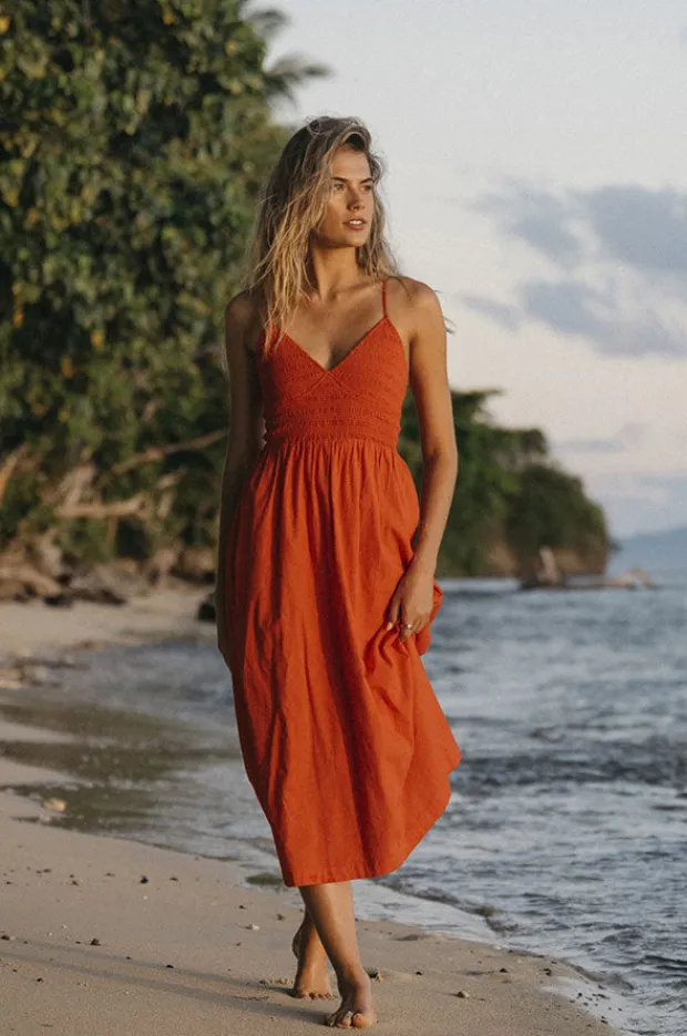 Billabong Such A Trip Dress in Red features a V-shaped neckline, adjustable straps, smocked bodice, midi length, and is available in sizes S-2XL.