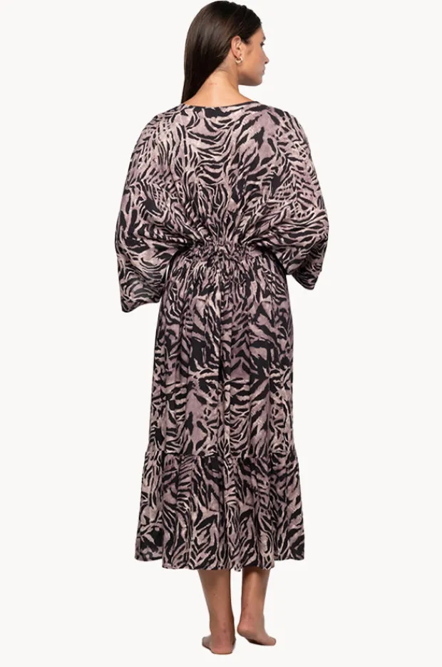 Nip Tuck Tuamotu Corrimal Maxi Dress in Animal offers long kimono style sleeves, lace up front, adjustable waist with back tie, and is available in O/S.