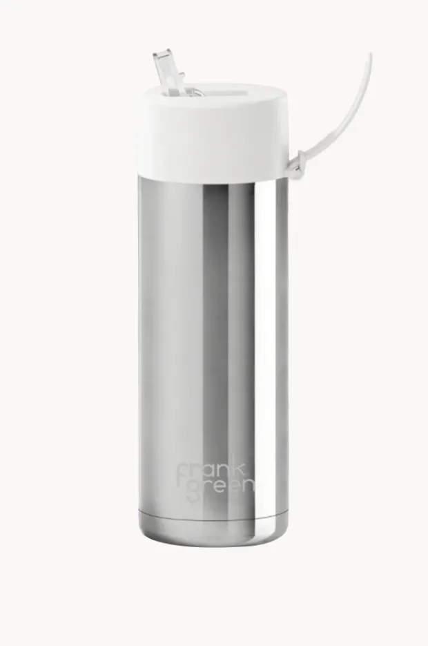 Frank Green Chrome Ceramic Drink Bottle 595ml in Cloud offers a straw lid, carry handle, triple wall vacuum insulated body, is available in a 595ml capacity.